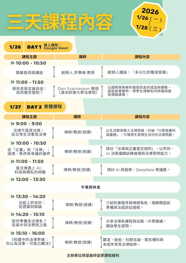 - 高水平師資 × 法律實務接軌: 從生活案例、法律趨勢議題到法庭流程,全程由律師+教授指導。