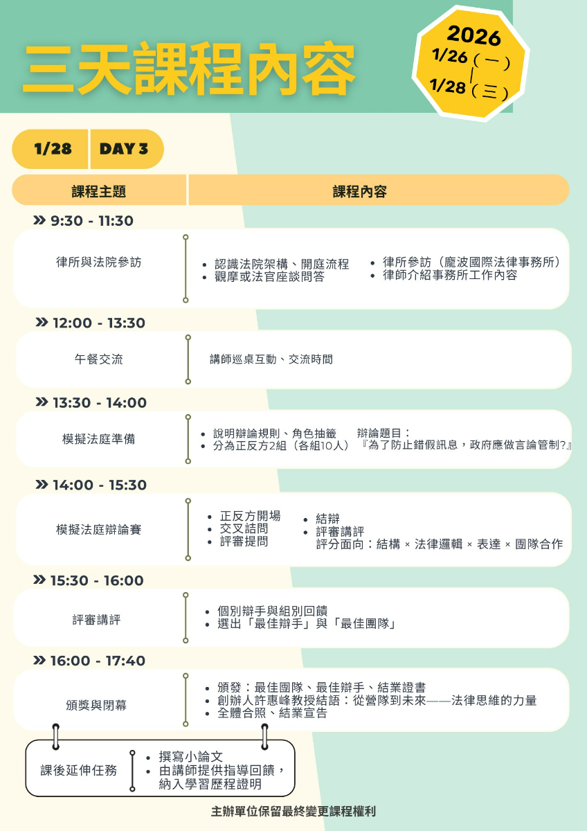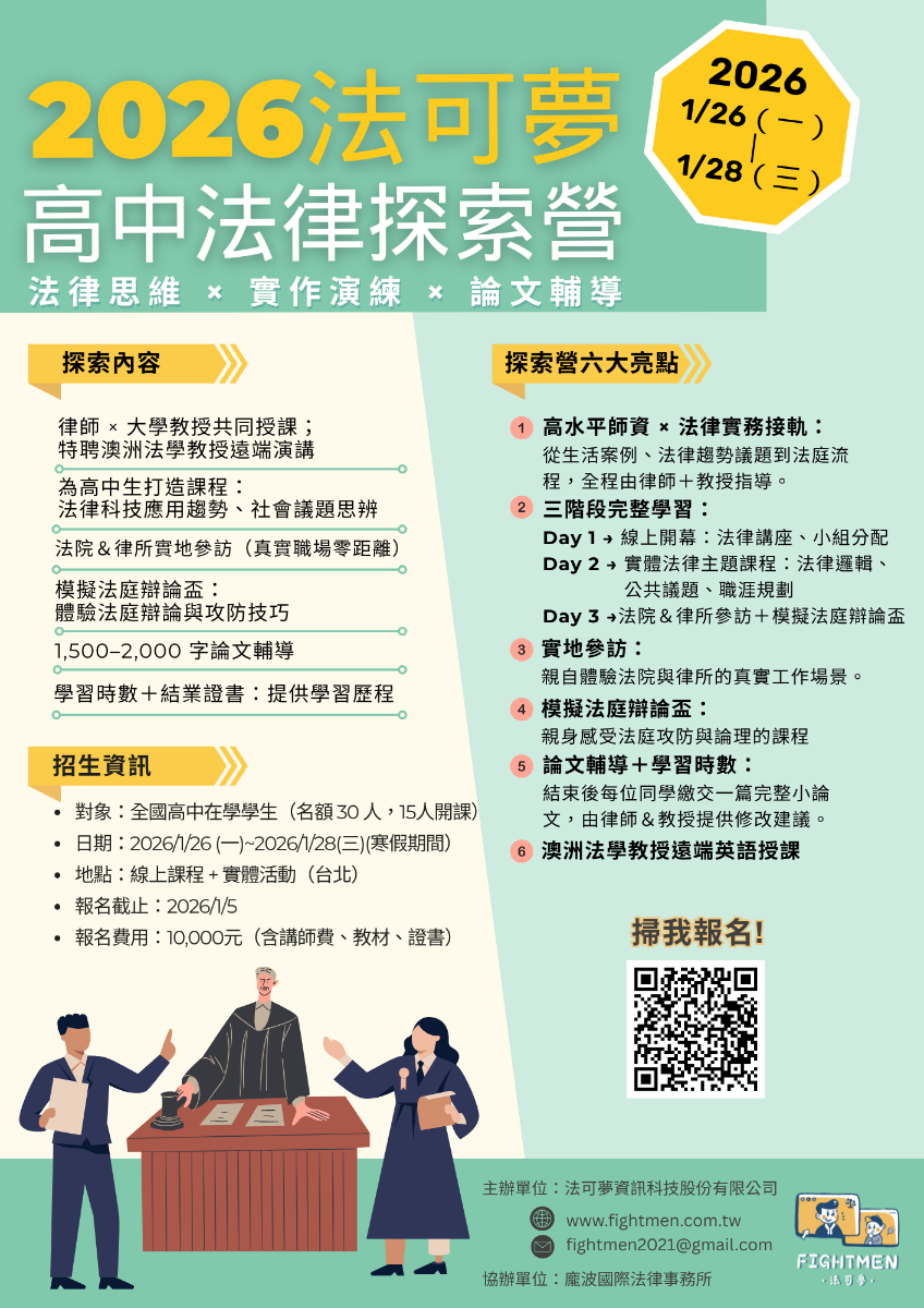 - 論文輔導+學習時數: 結束後每位同學繳交一篇完整小論文,由律師&教授提供修改建議。