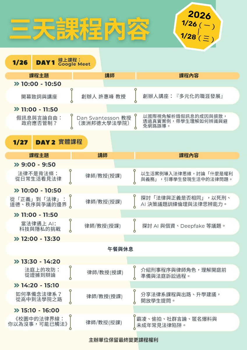 - 三階段完整學習: Day 1|線上開幕:法律講座、小組分配